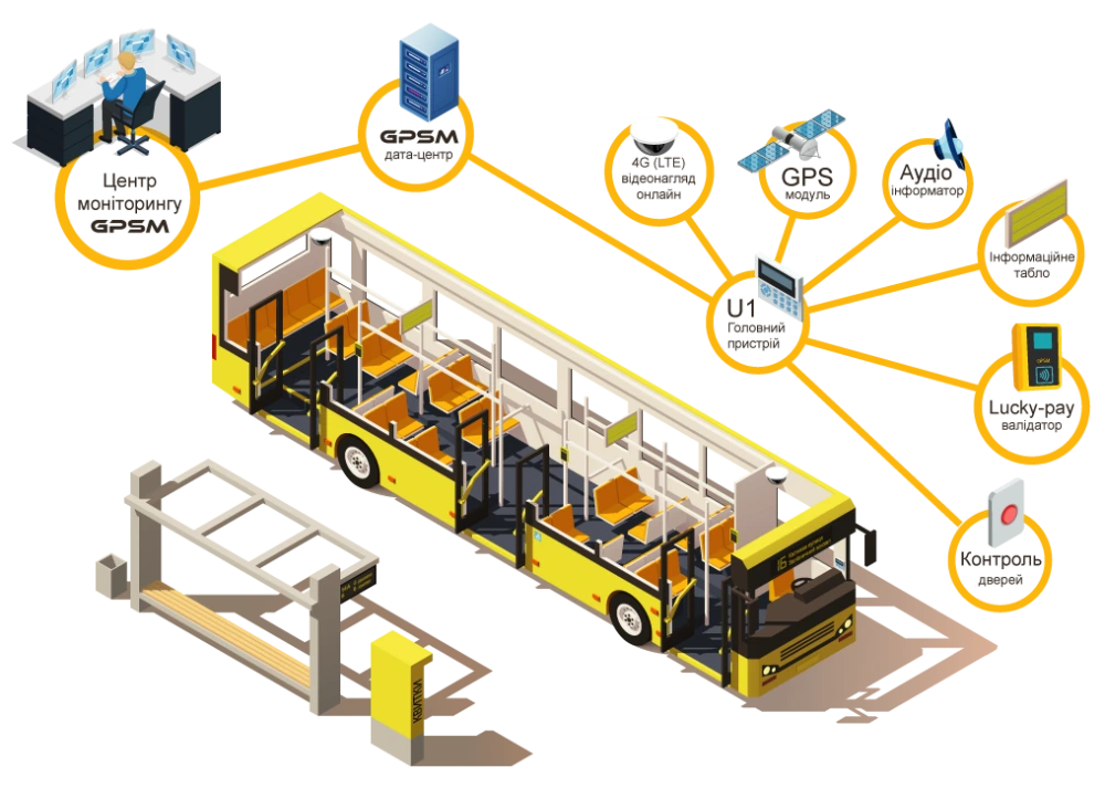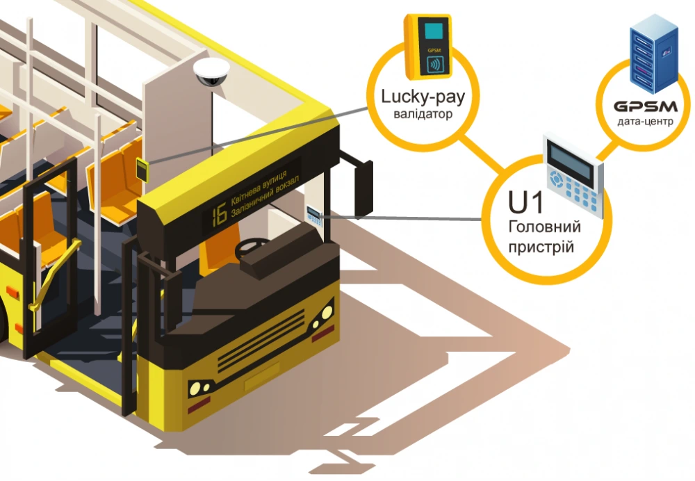 • Главное устройство водителя GPSM U1 - отображается текущие валидации, количество пассажиров, позволяет водителю изменять маршрут движения и тарифный план. Главное устройство связывается с сервером и передаёт информацию про осуществленные валидации (оплату проезда).