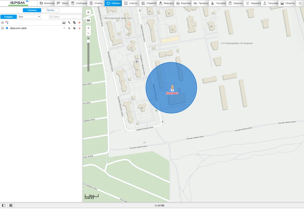 Геозона (Дедушкин двор), в случае если объект покинет геозону, вам придет тревожное сообщение на смартфон