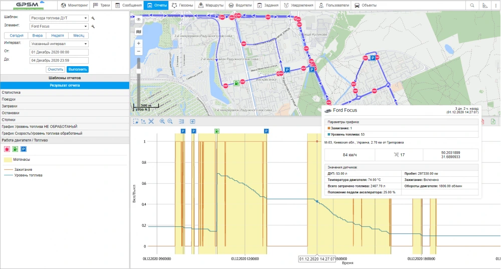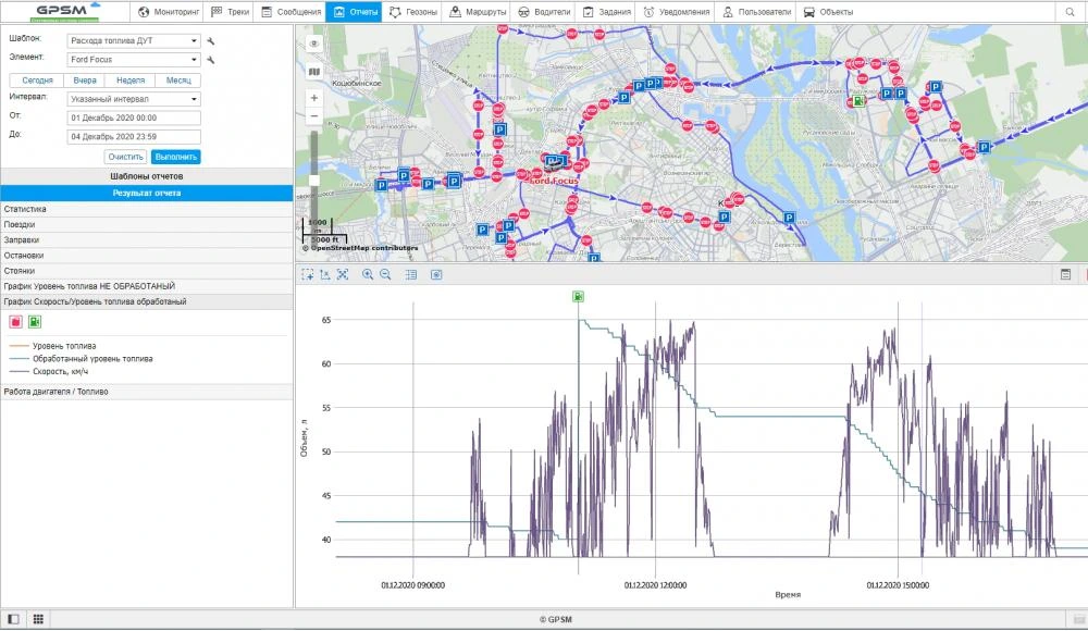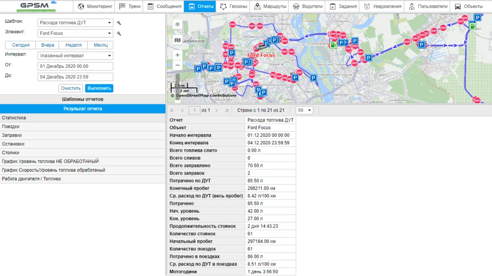 - Отчеты по маршрутам движения, поездкам, стоянкам, остановкам;