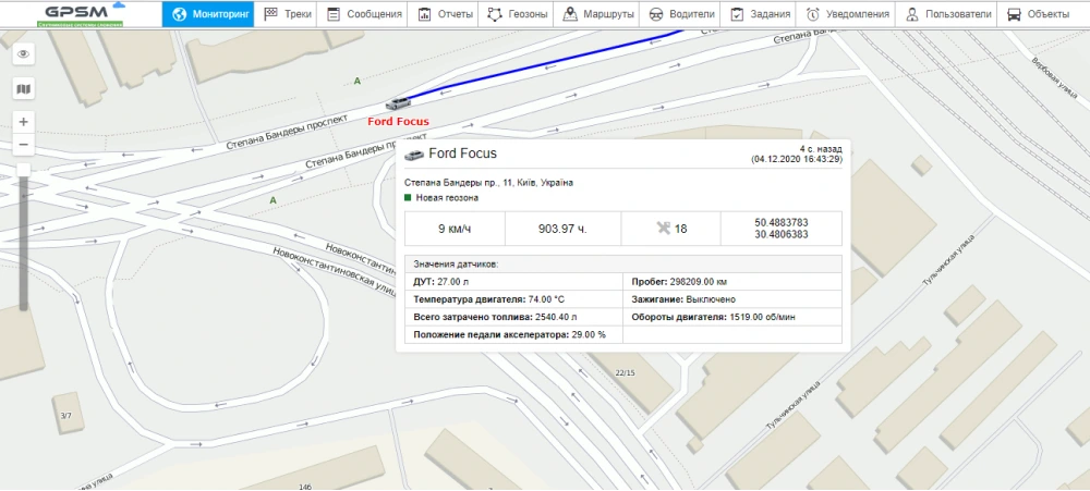 На вкладке «Мониторинг» представлены основные функции GPS мониторинга. Здесь можно наблюдать за перемещением объекта на карте, адрес нахождения ТС в реальном времени, а также количество топлива в баке.