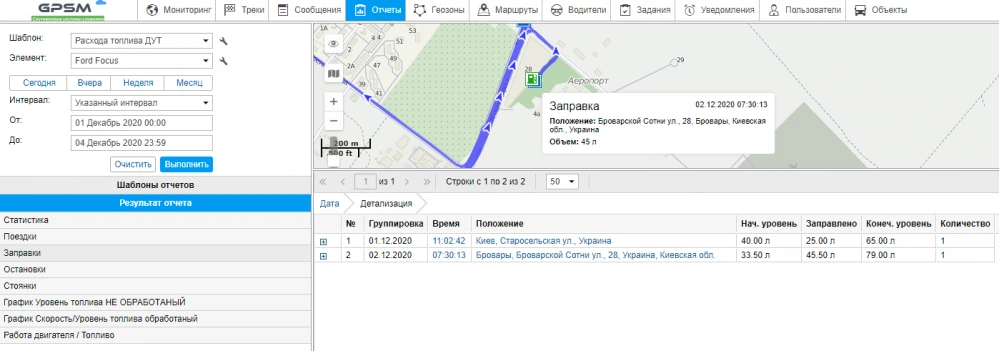 5. Отчет по заправкам. Данный отчет позволяет узнать, где и когда была произведена заправка объекта.