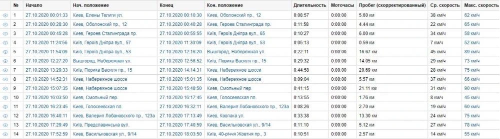 2. Отчёт по поездкам. В отчёте «Поездки» данные формируются с указанием времени и места начала поездки, времени и адреса конечного положения. Фиксируются данные о продолжительности поездки, пробеге, средней скорости, максимальной скорости.
