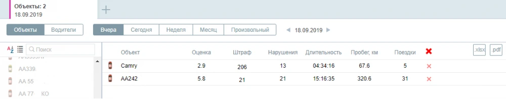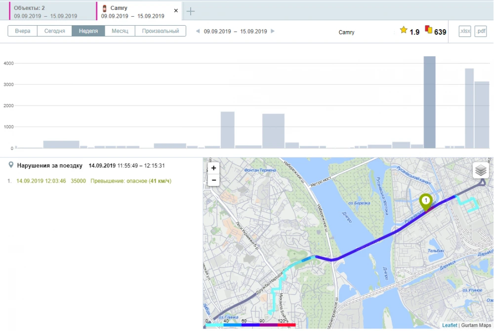 Система быстро обрабатывает и отображает качество вождения за любой выбранный период: вчера, сегодня, неделю, месяц, произвольный период (данные сохраняются 1 год):