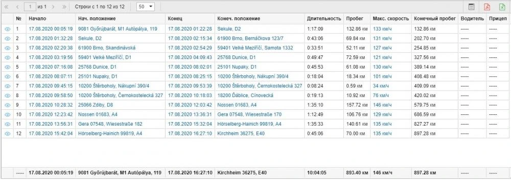 3. Отчёт поездкам. В отчёте «Поездки» данные формируются с указанием времени и места начала поездки, времени и адреса конечного положения. Фиксируются данные о продолжительности поездки, пробеге, средней скорости, максимальной скорости.