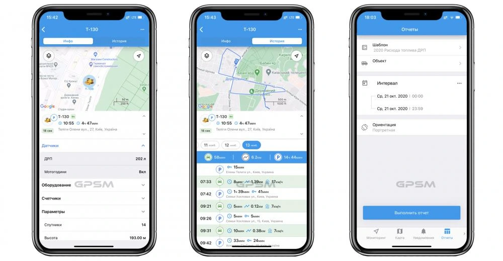 Мобільний додаток Local GPSM надає можливість стеження за транспортом в реальному часі, показує інформацію з датчиків палива (кількість палива в баку, витрата, заправки, сливи), відображає дані про пробіг, поїздках, маршрутах, стоянках. Відправляє повідомлення про події на смартфон. Створення звітів в PDF.