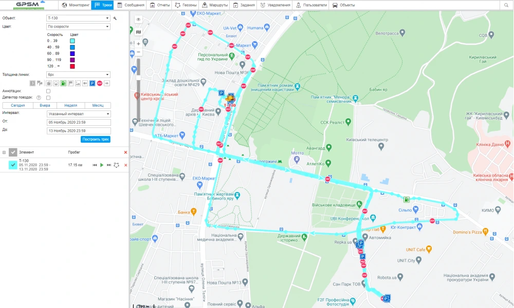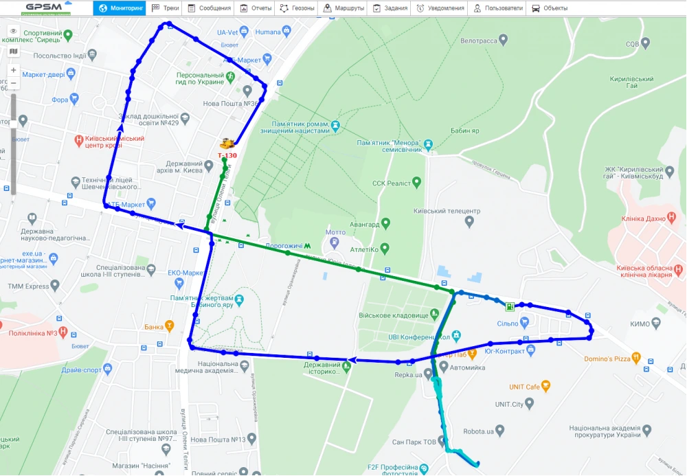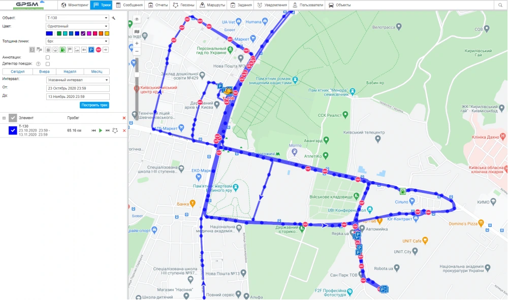 1. Побудова треку - траєкторія об'єкта на карті. Трек будується по точках і з'єднується відрізками в єдину лінію. На трек можуть бути нанесені маркери, які позначають місця, де відбувалися парковки, заправки та інші події.
