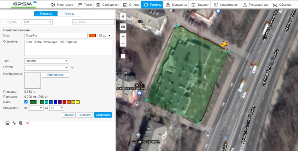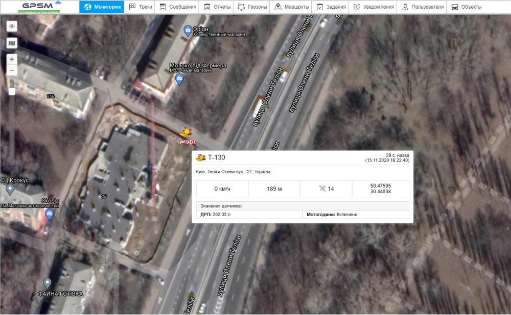 На вкладці «Моніторинг» представлені основні функції GPS моніторингу. Тут можна спостерігати за переміщенням об'єкта на карті, адреса знаходження ТЗ в реальному часі, а також кількість палива в баку.