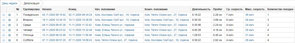 2. Звіт по поїздкам. У звіті «Поїздки» дані формуються із зазначенням часу і місця початку поїздки, часу і адреси кінцевого положення. Фіксуються дані про тривалість поїздки, пробігу, середньої швидкості, максимальної швидкості.