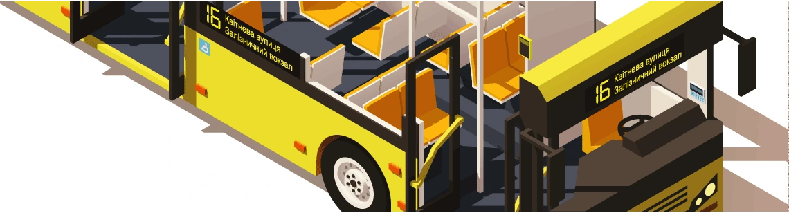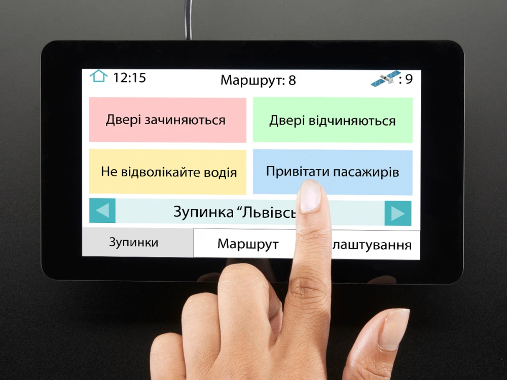 - Табло у вигляді рядка, що біжить, на якому відображається назва поточної зупинки, наступна зупинка. Опціонально: температура в салоні, час.