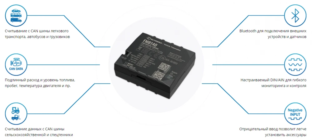- Бесконтактное считывание данных о производительности и эксплуатации транспорта с CAN шины без необходимости манипуляций с проводами.