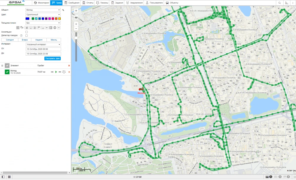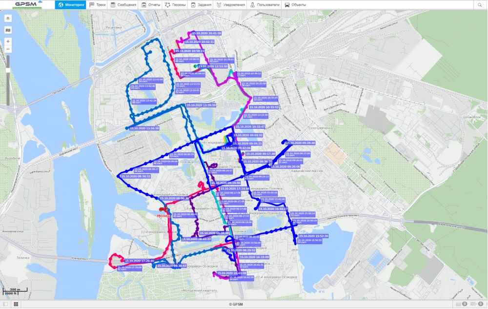 1. Построение трека: трек отображается как линия перемещения объекта на карте. Линия строится по точкам и образует совокупность отрезков. На трек можно наносить маркеры для обозначения остановок, парковок, превышения скорости и т.д.