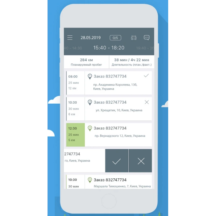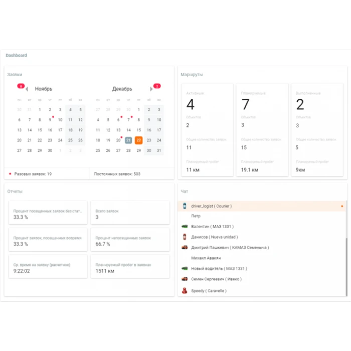 - Routes formation. The choice of a specific order, the selection of transport for it, the construction of a route with the calculation of travel time and mileage.