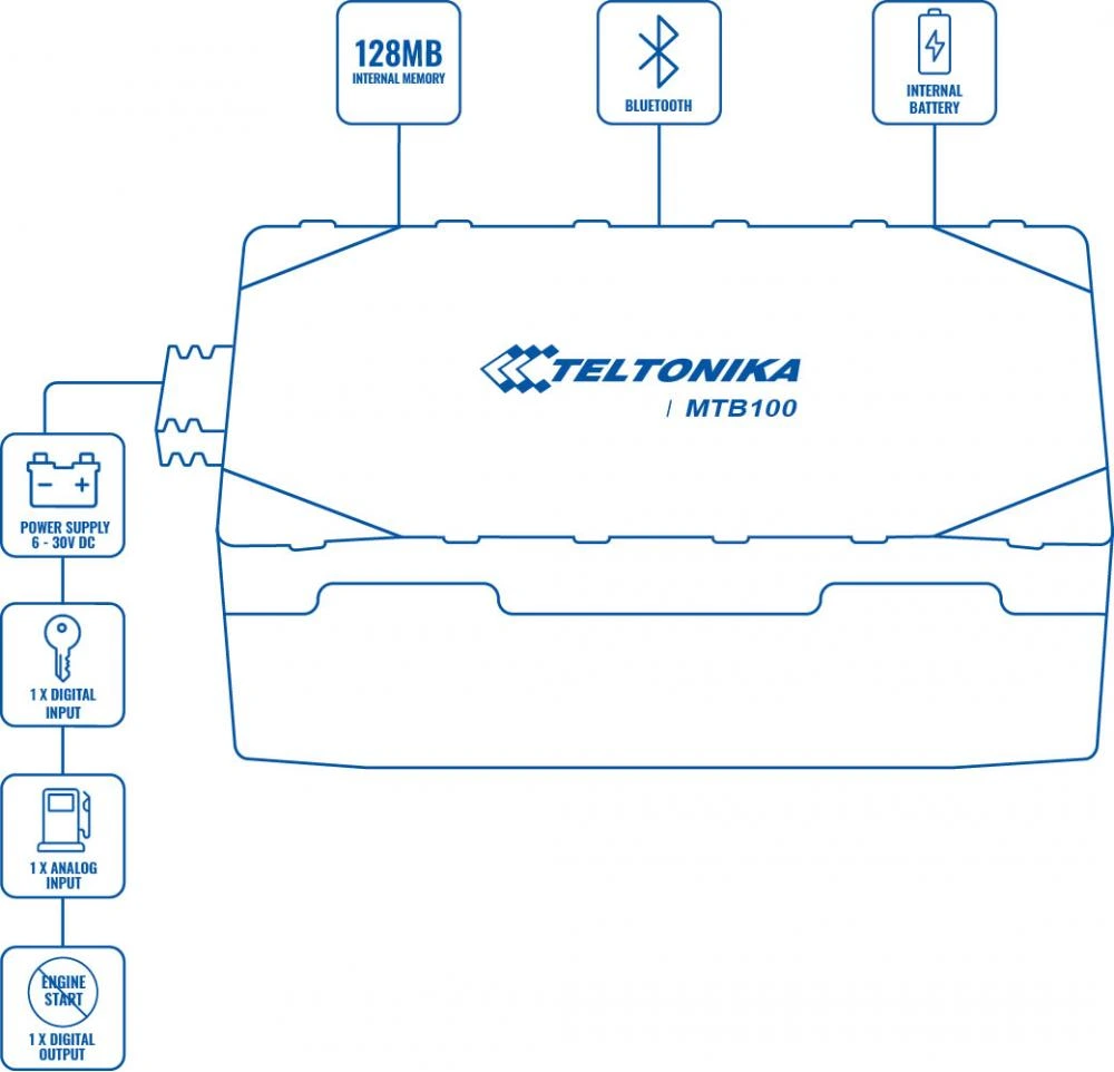 Teltonika MTB100 - компактний трекер з опцією Bluetooth, підходящий для установки на мотоциклах і електросамокатах,. Він може використовуватися і в легкових авто, зокрема, в автопарках і таксі. Пило і вологозахисне виконання корпусу (IP 54) забезпечує надійну роботу пристрою в будь-яку погоду.