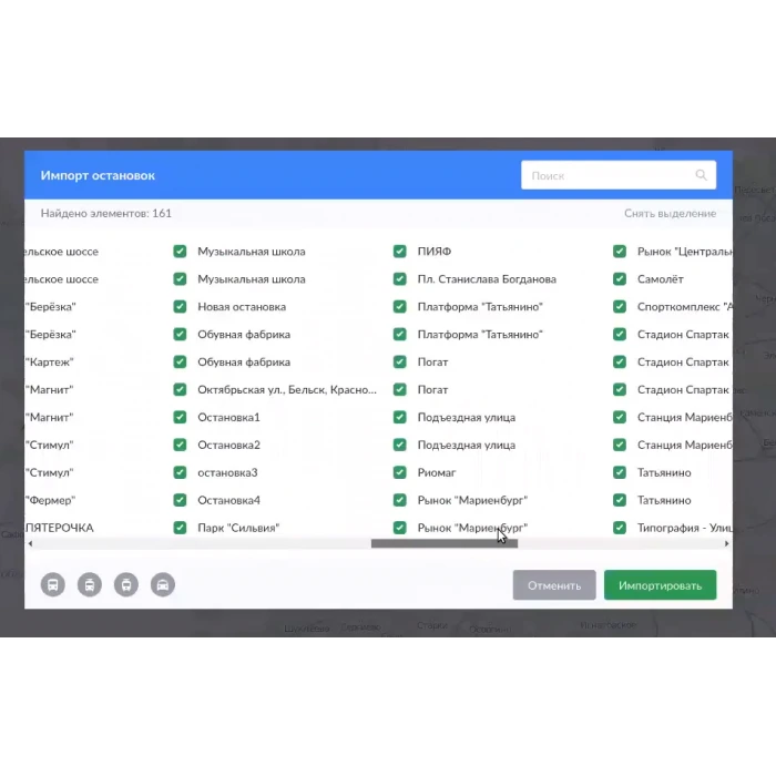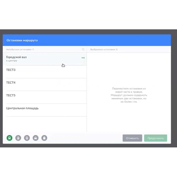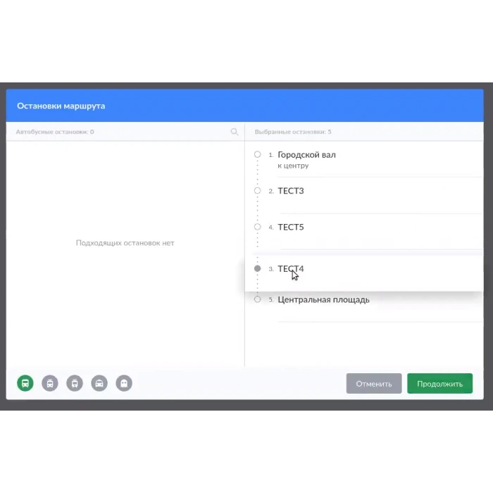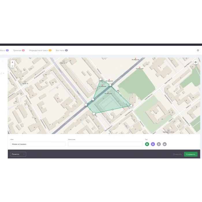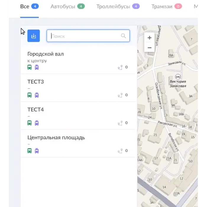 1. Работа с остановками. Добавление новых остановок для различных типов транспорта с опцией поиска и детальным описанием.