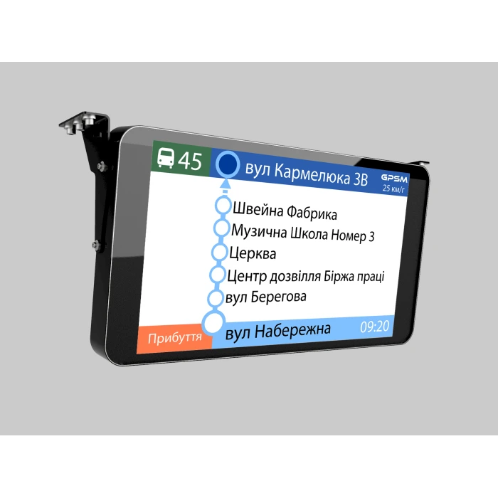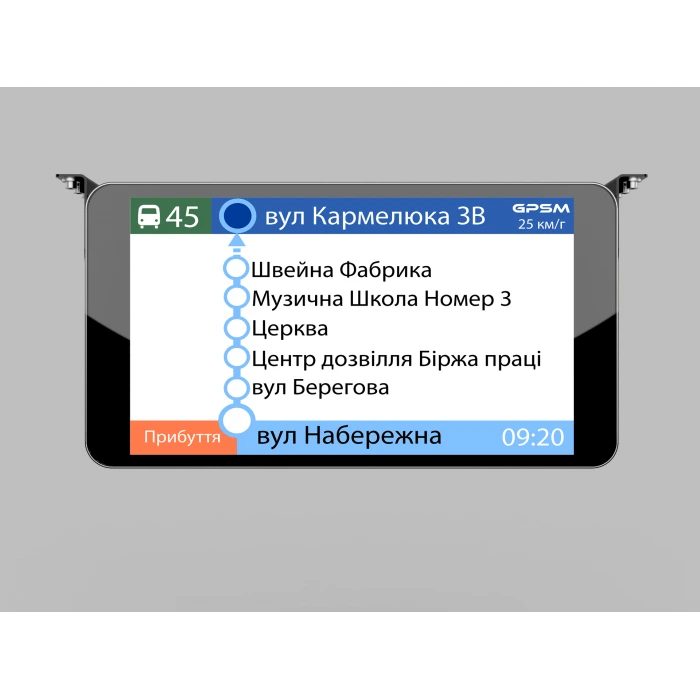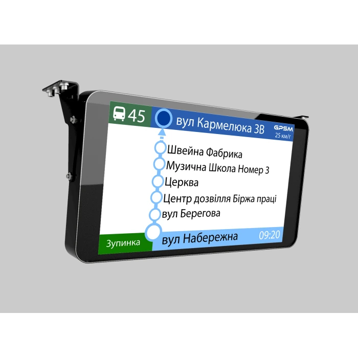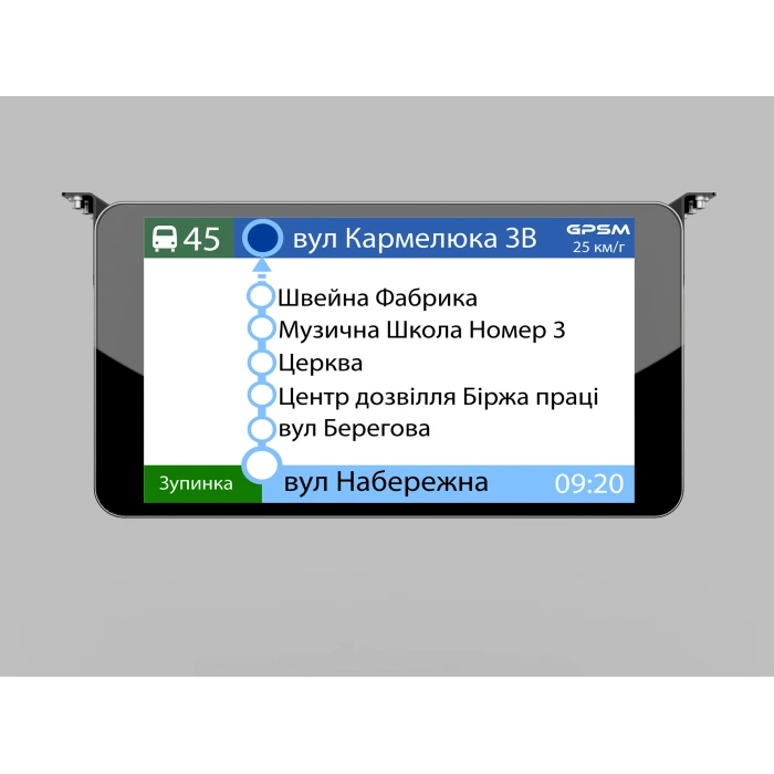 Устанавливается GPS автоинформатор, к нему подключается дисплей или несколько дисплеев. Автоинформатор GPSM - это бортовой компьютер, который выводит на дисплеи в графическом видео (текущую остановку, следующие, прогноз прибытия в каждой точке, время, скорость). Графический интерфейс водителя выглядит следующим образом: