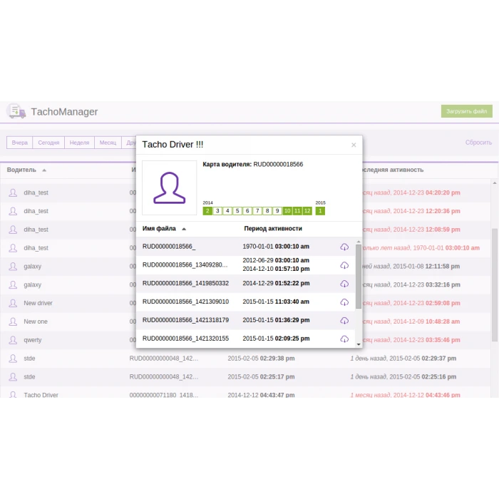У програмі Tacho Manager водій може завантажувати DDD-файли на сервер системи для зберігання. Доступні ручне та автоматичне завантаження. Модуль сам по собі, доступний для скачування в меню Apps.