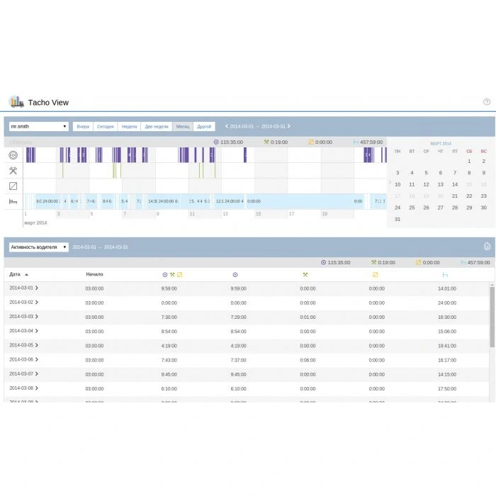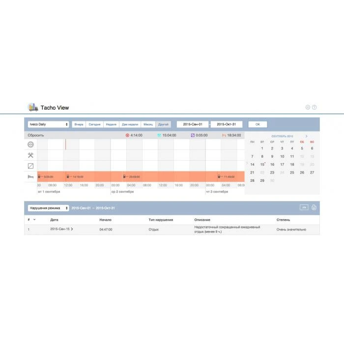 Додаток аналізує інформацію, що надходить з тахографа за наступними позиціями: водіння, робота, резерв, відпочинок. Швидко знайти потрібний період активності водія допоможе наочна тимчасова шкала.