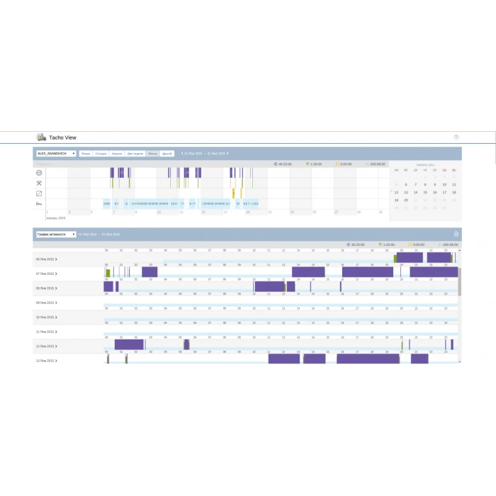 - “Графік активності”. У цьому виді звітів таймлайн розділено відповідно до діб, а інтервали та види активностей водія виділені певним кольором.
